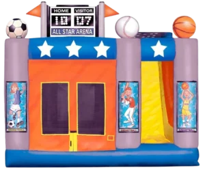 - 4-in-1 Moon Bounce Combos – These moon bounce combos come with a bounce area, basketball hoop, climbing wall and slide