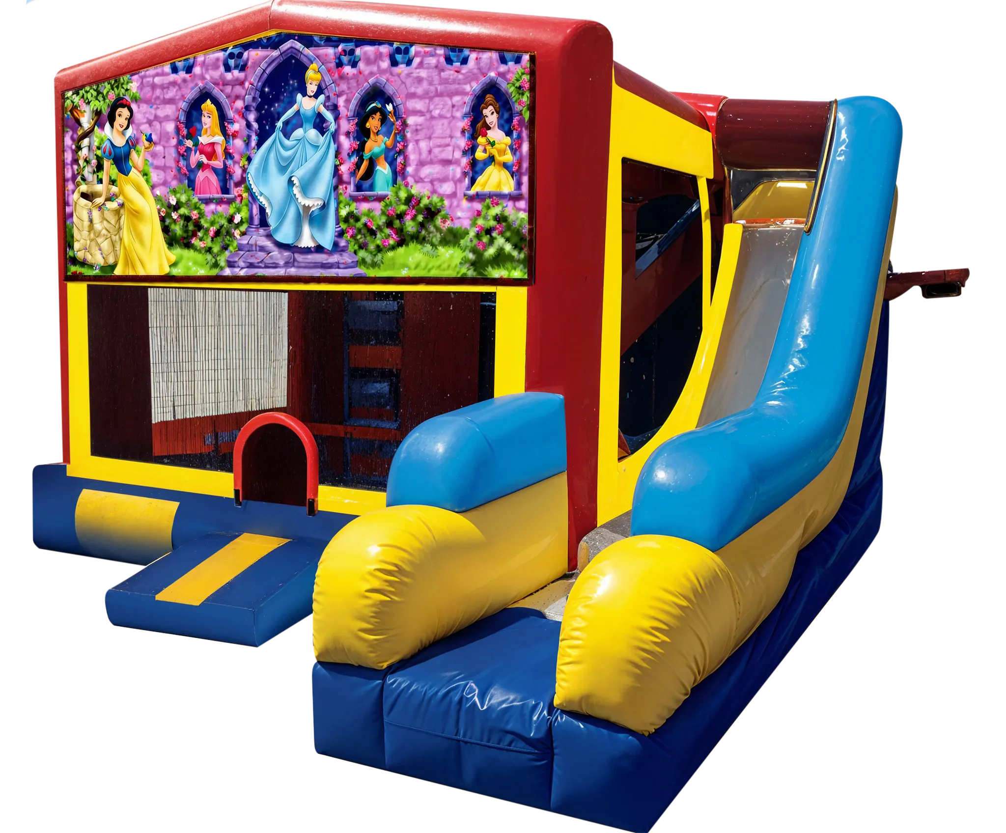 Make your child feel like royalty with our Princess 5-N-1 Moon Bounce Obstacle Combo. Featuring three beautiful princess scenes, this unit brings a fairytale look that kids love. Inside, guests can enjoy a large jumping area, a basketball hoop, interactive obstacles, a climbing wall, and a fast slide that keeps the fun going all party long.