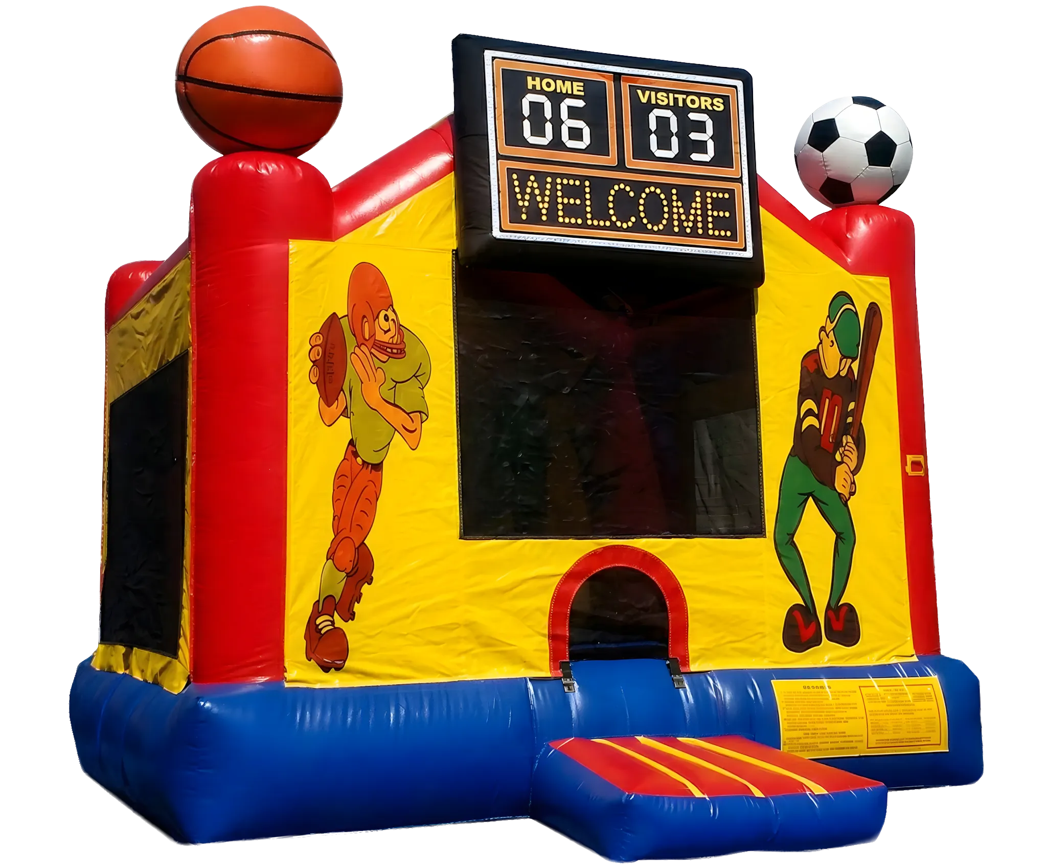 Whether you’re celebrating a birthday, a big team win, or just want some active fun, this Sports Moon Bounce w/ Hoops Inside is the perfect choice. Kids can jump, play, and shoot hoops with the built-in basketball hoop inside. With its fun sports theme and player graphics on the front, it’s a great pick for any sports fan or team celebration!