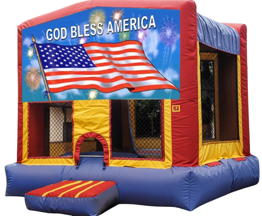 This God Bless America Themed Moon Bounce is the perfect addition to your July 4th celebration or summer block party. It comfortably fits around 7–10 kids at a time, depending on their age and size, making it a great way to keep the fun going all day long. Bring the red, white, and blue to life with this patriotic inflatable, and make the party even better by pairing it with our July 4th favorite Sno-Cone Machine rental, also decked out in festive colors.