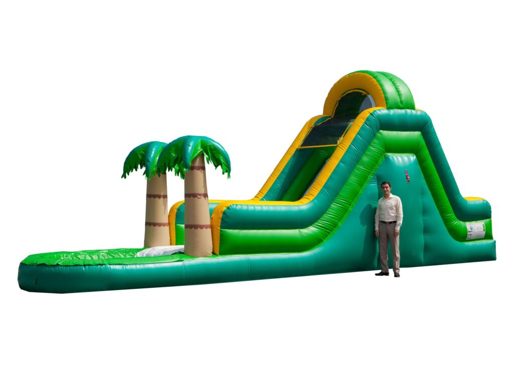 Looking for something to keep your little ones entertained all day? Astro Jump’s new 14′ Island Dive Water Slide can bring that right to your own backyard! Kids can climb to the top and slide down on the single lane slide past two palm trees to make a splash in the pool below. With its bright island colors and exciting design, this water slide is sure to be a hit with kids at any summer party or event. Love this slide but love dolphins too? Check out our 14′ Dolphin Dive Water Slide today!