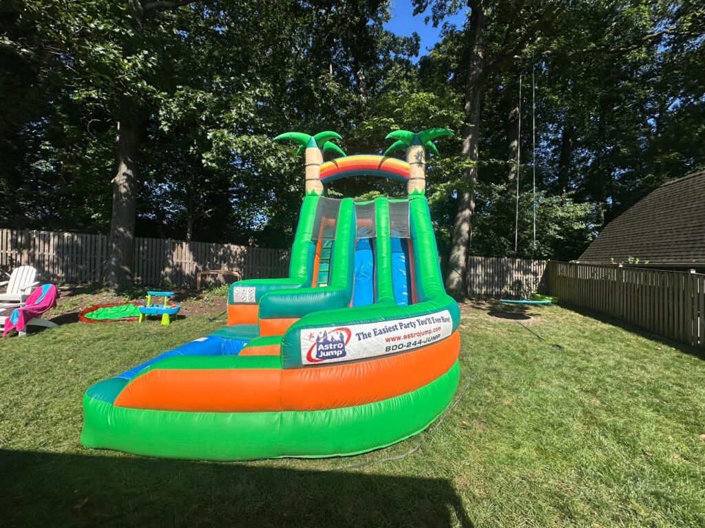 Having a tropical themed event and want a water slide but don’t have a ton of space? Then add our 16′ Tropical Wild Splash Water Slide W/Pool for a ton of fun! This inflatable water slide has dual lanes and a sharp curve at the bottom that splashes you into the pool waiting at the bottom for an extra fun finish, this slide is perfect for kids looking to stay cool on a hot summer day! Contact an event planner today to reserve our 16′ Tropical Wild Splash Water Slide W/Pool!