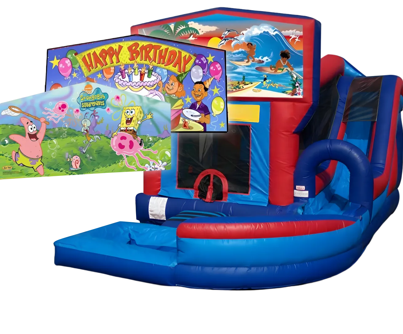 Our Jump N Splash Water Slide Combo W/Pool brings all the fun combined in one exciting inflatable! Kids can jump, climb, shoot hoops, and go down the water slide until their energy runs out. The spacious jumping area features a slip-resistant surface for safety when wet, so your little ones can climb up the ladder and race down the curvy single lane water slide into the splash pool safely. To make it even more special, you can customize the theme to match your party, from Unicorns and Princesses to Cars, Sports, Superman, and more!